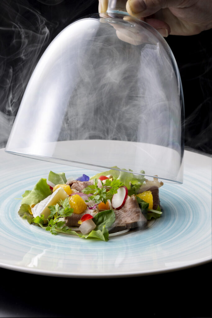 ◦鴨ロース肉のエピス風味とフランス産カマンベールチーズのサラダ仕立て瞬間スモークで