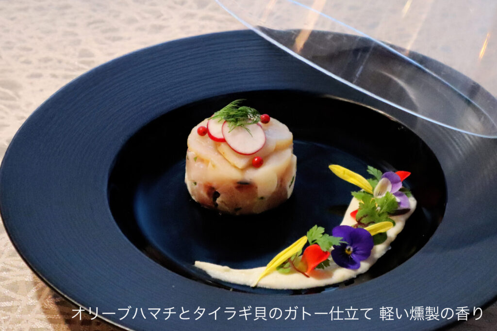 ◦オリーブハマチとタイラギ貝のガトー仕立て 軽い燻製の香り