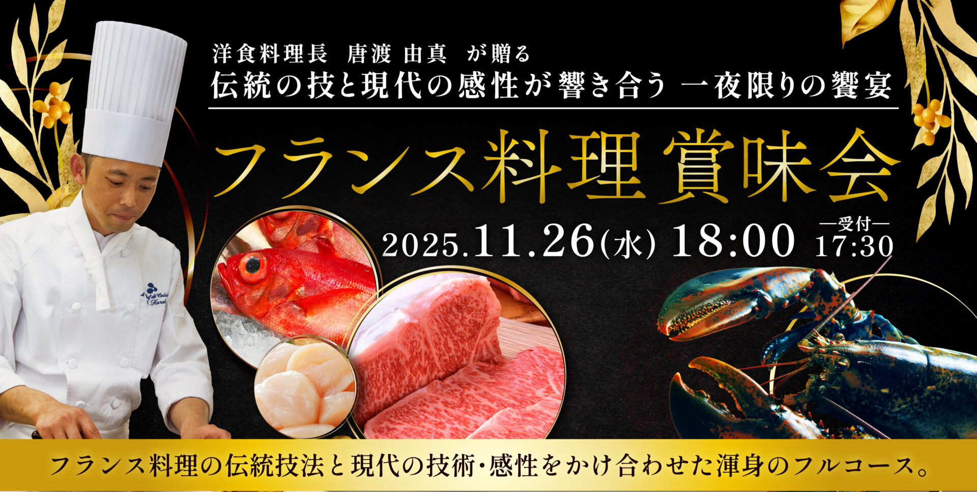 11/26(水)洋食賞味会開催 2025.10.09 洋食料理長 唐渡 由真が贈る伝統の技×現在の技術・感性が響きあう一夜限りのスペシャルフルコース。 贅沢で美味たる時間をお約束します。ぜひご期待ください。 【当日使用する厳選食材を特設サイトに公開中】 トップページへ